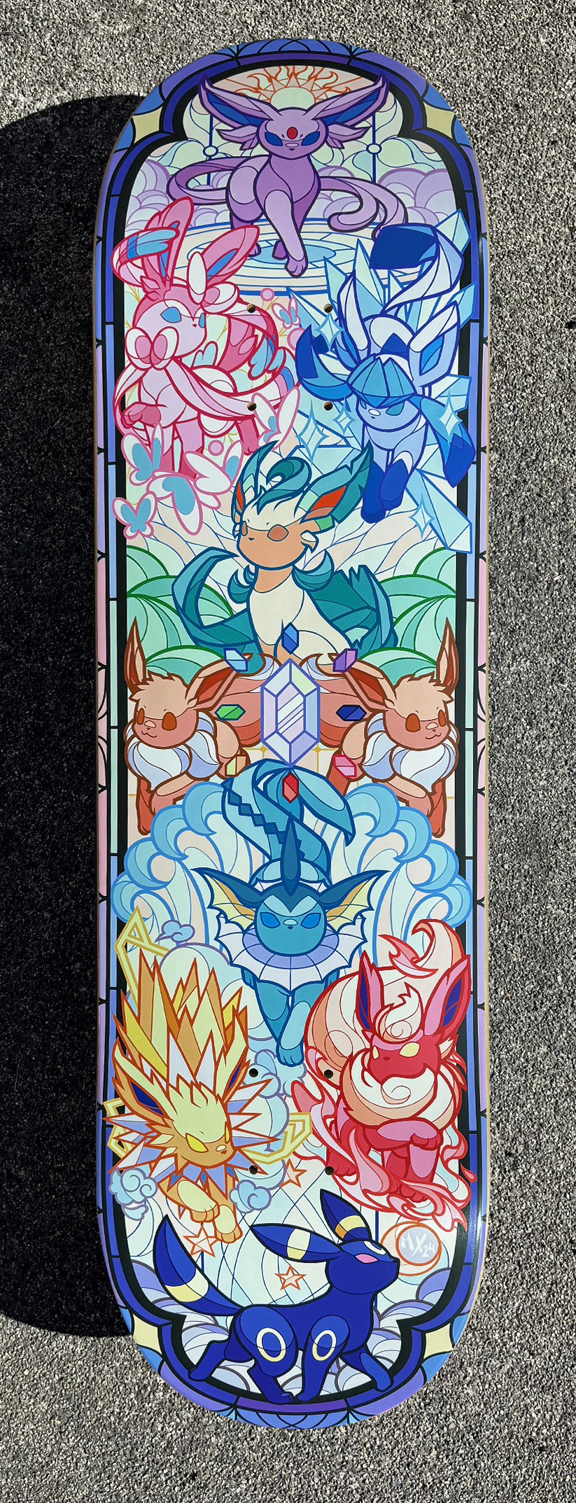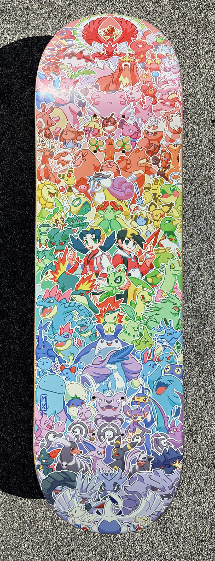 Individually hand applied and sealed HD satin vinyl graphic on skateboard deck.